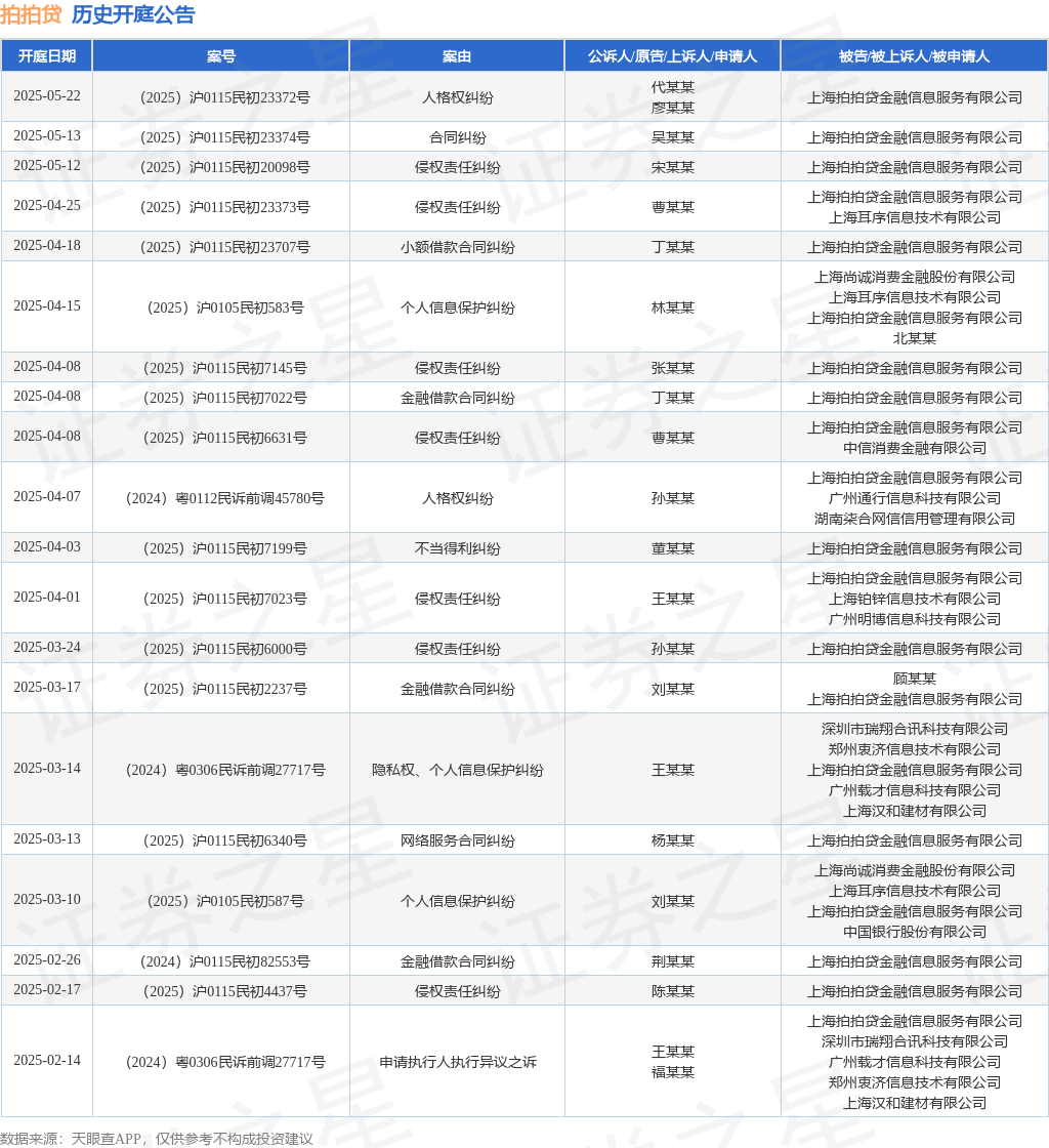 本站消息,根据天眼查APP显示,近日公布了一则上海拍拍贷金融信息服务有限公司作为被告/被上诉人的开庭公告,详细内容如下: